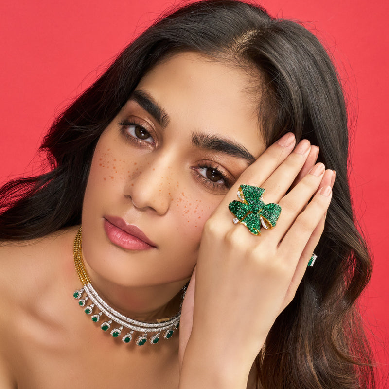 Big, bold and statement bow in hallmarked 18 Kt Gold, studded with Zambian emeralds in Pavé setting. Style it with your white shirt for your girls brunch or a dramatic evening look, to make a statement!