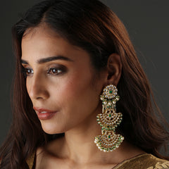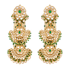 The evergreen chandbali’s made even versatile by layering it up. It can be dressed down as just the ear tops or dressed up with one layer of the chandbala or even two for a shoulder sweeping length. Dress as you desire! Polki, Emeralds and Japanese pearls crafted in 18KT Yellow Gold