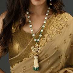 Beautifully inspired by the tree of life this Polki Emerald Sautoir is a delicate piece with lush Green Zambian Emeralds, brilliant diamond polkis, and iridescent South Sea Pearls. Beautifully statement new age heirlooms.