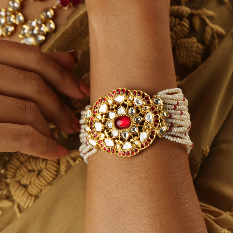 The bejewelled garden of Rubies, Polki held together with a bunch of pearls. Do appreciate the miniature floral engravings on the underside of this bracelet, Design Finesse and luxury unmatched.
